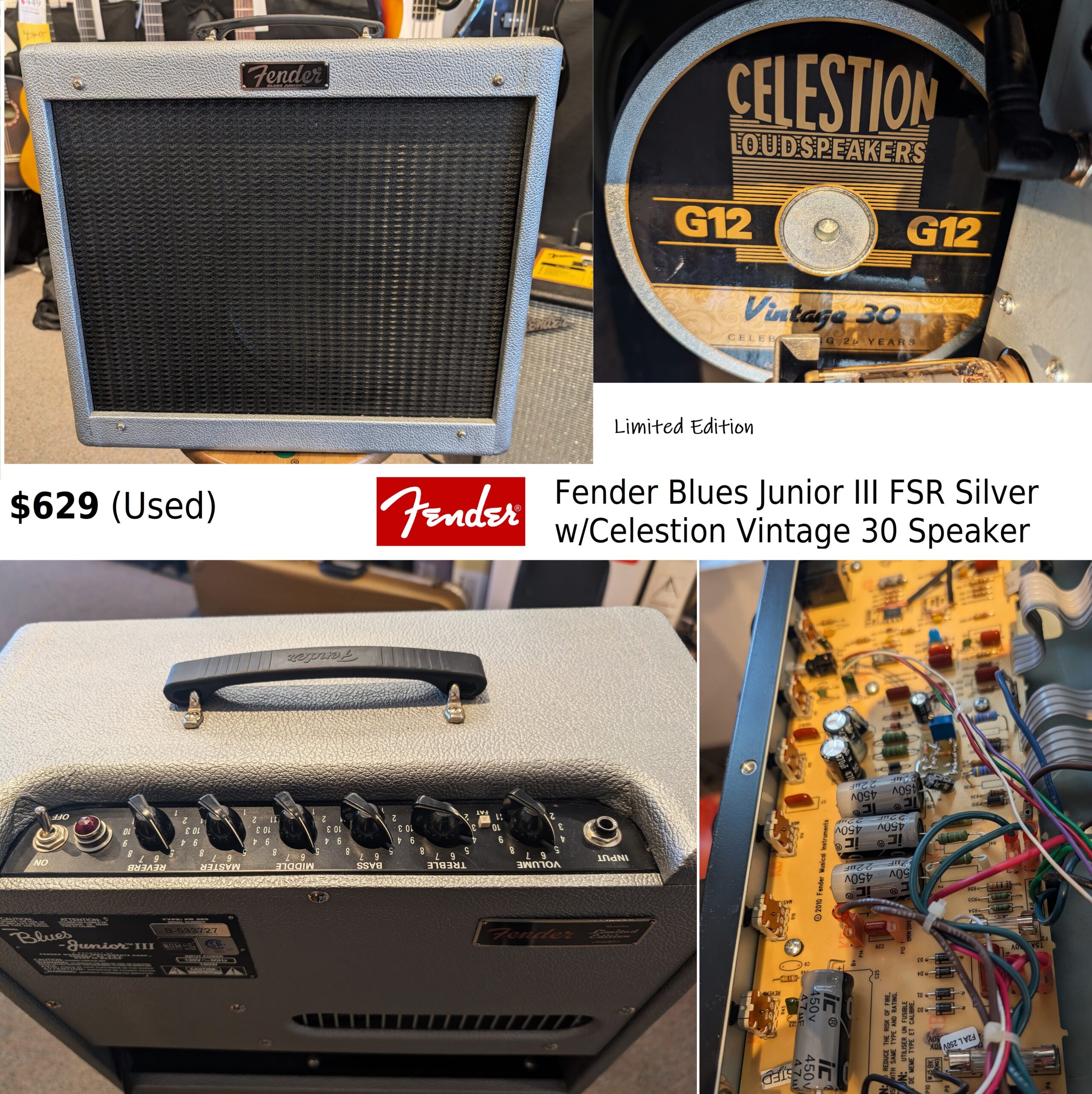 Fender Blues Junior III FSR Silver w/Celestion Vintage 30 Speaker (Like New)